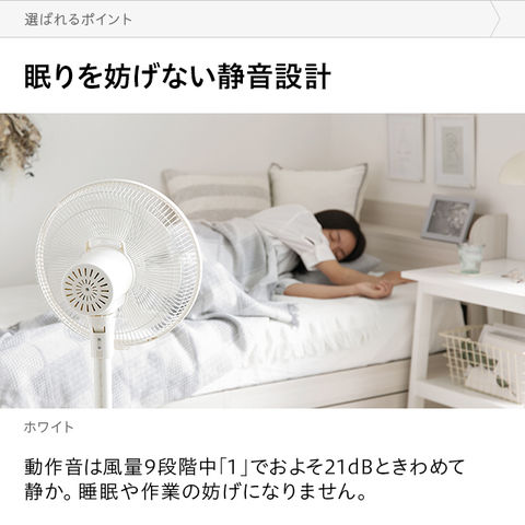 動作音は風量9段階中「1」でおよそ21dBときわめて静か。睡眠や作業の妨げになりません。
