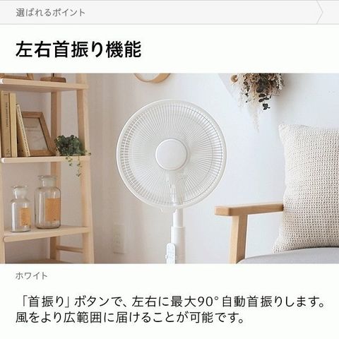 「首振り」ボタンで、左右に最大90°自動首振りします。風をより広範囲に届けることが可能です。