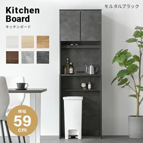 レンジボード 食器棚 キッチンボード 組合せ自由 幅59cm ゴミ箱 上 収納 収納棚 キッチン収納 2口 コンセント レンジ台 カップボード スリム ハイタイプ 木製 キャビネット 扉付き 北欧 チェスト 大容量 収納家具 おしゃれ【モルタルブラック】 小型商品(佐川)
