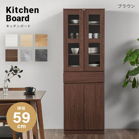 食器棚 カップボード キャビネット 幅59cm 収納 組合せ自由 キッチンボード 収納棚 キッチン収納 引き戸 棚 扉付き スリム ハイタイプ 木製 ガラス扉付き 北欧 チェスト 大容量 収納家具 3段 おしゃれ キッチン【ブラウン】 小型商品(佐川)