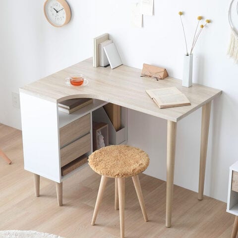 複数の作業を効率的に行える収納付きのL字型デスク。ナチュラルな北欧デザインでリビングや書斎だけでなくオフィスにも自然と馴染みやすく、限られた空間で日々のデスクワークをより快適にする一台です。