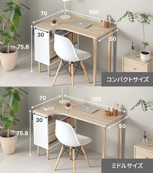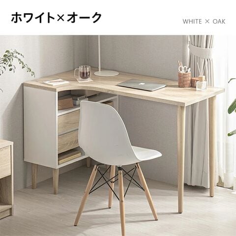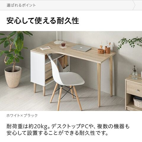 複数の作業を効率的に行える収納付きのL字型デスク。ナチュラルな北欧デザインでリビングや書斎だけでなくオフィスにも自然と馴染みやすく、限られた空間で日々のデスクワークをより快適にする一台です。