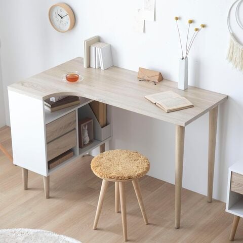 複数の作業を効率的に行える収納付きのL字型デスク。ナチュラルな北欧デザインでリビングや書斎だけでなくオフィスにも自然と馴染みやすく、限られた空間で日々のデスクワークをより快適にする一台です。