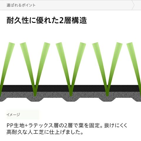2層構造で芝葉を固定。葉の抜けにくい、高耐久な人工芝に仕上げました。