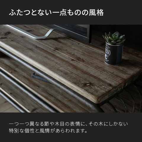趣ある杉古材と配管を模した金属フレームで作り出す繊細かつ工業的な雰囲気。長い年月で培われた古材の風合いや美しさをありのままに堪能できるテレビボードです。