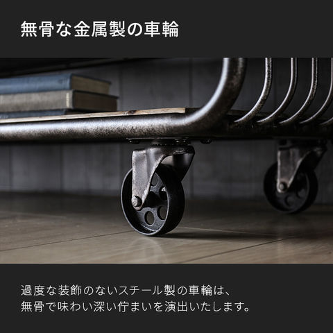 過度な装飾のないスチール製の車輪は、無骨で味わい深い佇まいを演出いたします。