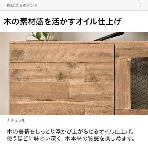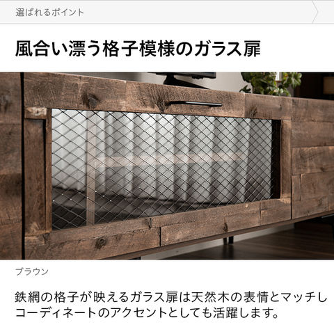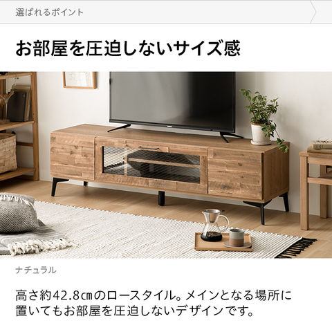 味わい豊かな天然木、マットなスチール脚、高級感漂うガラス、全てが見事に調和したテレビボード。細部にまでこだわりぬいたデザインは、見る人全てを魅了しお部屋をワンランク上の空間にしてくれます。