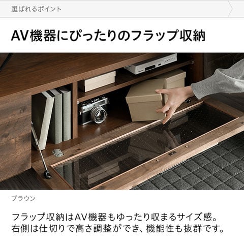 フラップ収納はAV機器もゆったり収まるサイズ感。右側は仕切りで高さ調整ができ、機能性も抜群です。