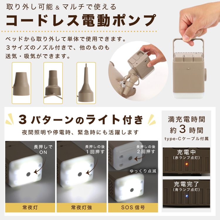 付属品(セット内容):専用収納袋/電動ポンプ/マルチノズル/Type-C充電ケーブル/同色の補修キット/耳栓×1セット/アイマスク×1/エアピロー×1(※カラーはベージュのみ)