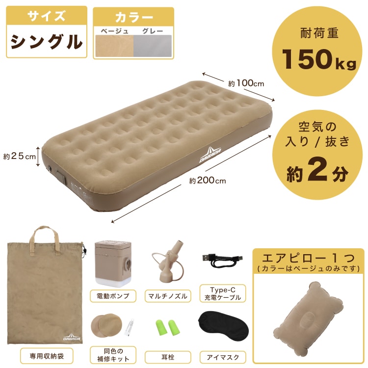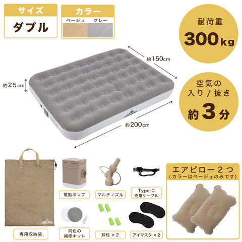 付属品(セット内容):専用収納袋/電動ポンプ/マルチノズル/Type-C充電ケーブル/同色の補修キット/耳栓×2セット/アイマスク×2/エアピロー×2(※カラーはベージュのみ)