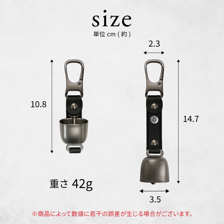 素材:鈴:鉄(メッキ加工)、カラビナ:亜鉛合金、ベルト:PU