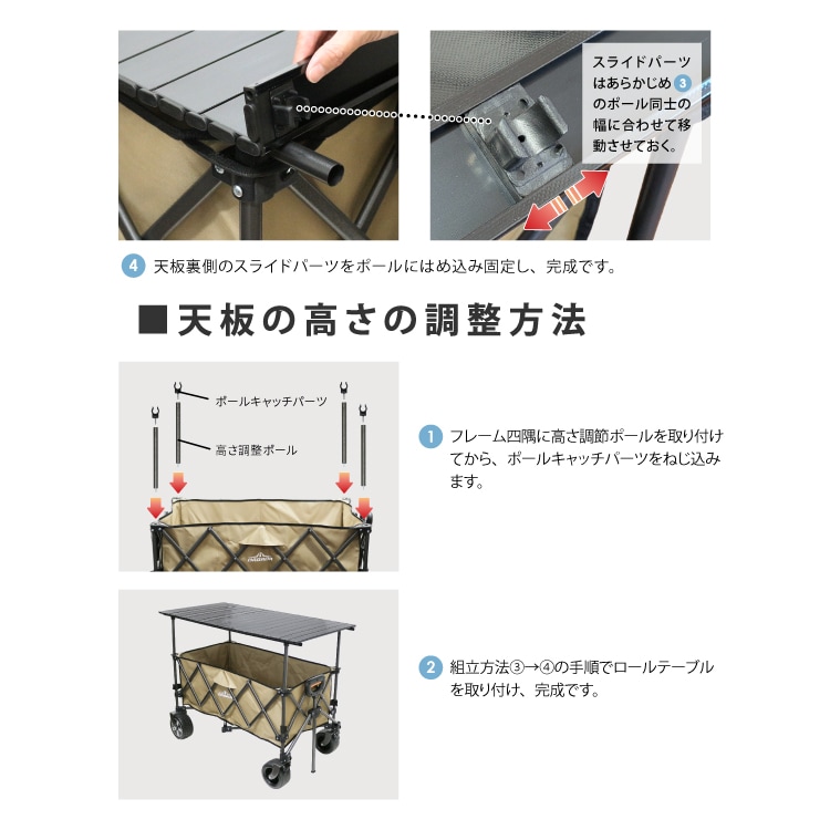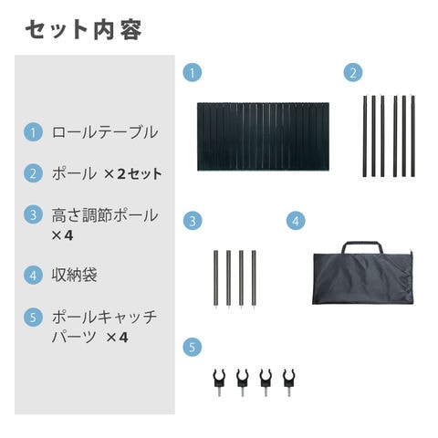 セット内容:ロールテーブル/ポール×2/高さ調節ポール×4/収納袋/ポールキャッチパーツ×4