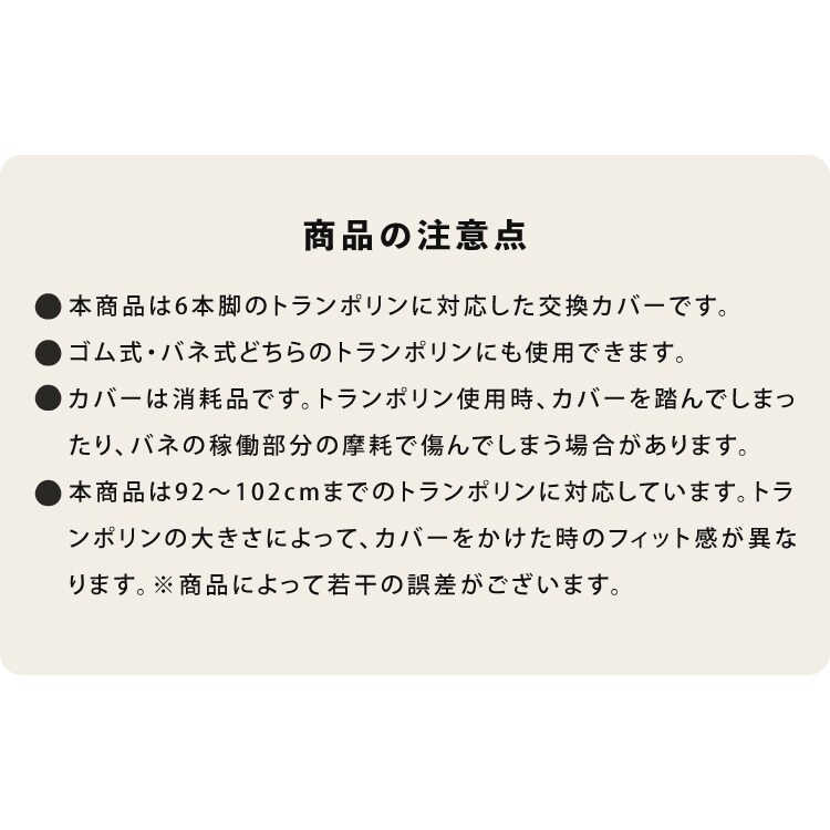 ・本商品は消耗品です。トランポリン使用時、カバーを踏んでしまったリ、 バネの稼働部分の摩耗で傷んでしまう場合があリます。