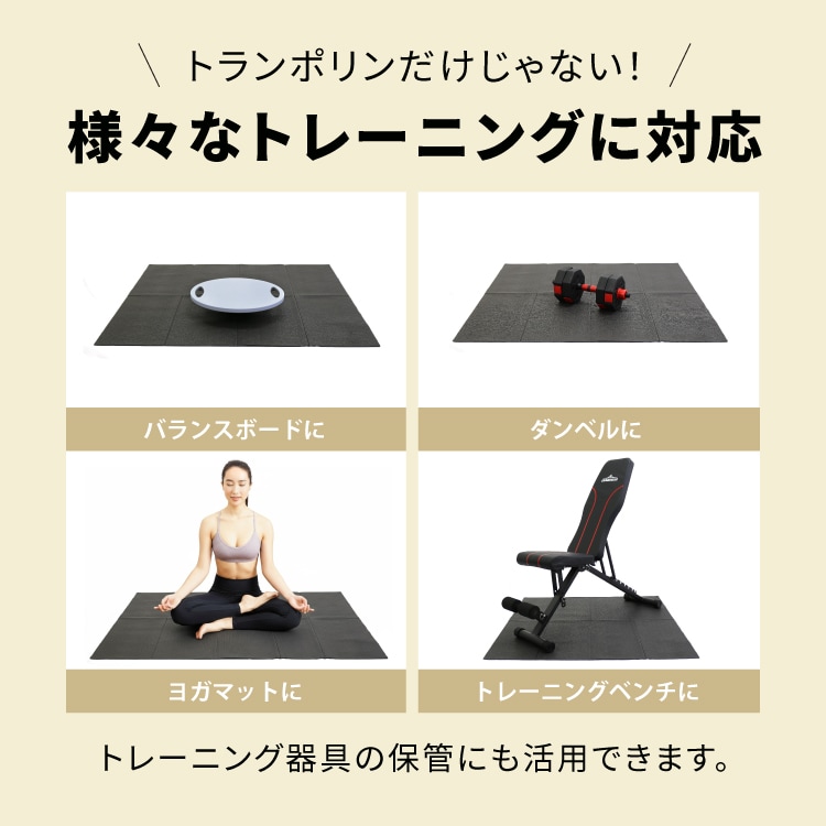 トランポリンマットとして使用する以外に、トレーニング・ヨガなど様々な用途にもご利用いただけます。