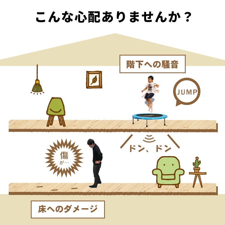 厚みが増える分、跳躍時にトランポリンの足がマットに沈み込む深さが変わるため、上に敷いているフロアマットに本来以上の負荷がかかり、予期せぬ凹みや、マットが貫通してしまうなど破損の原因となります。