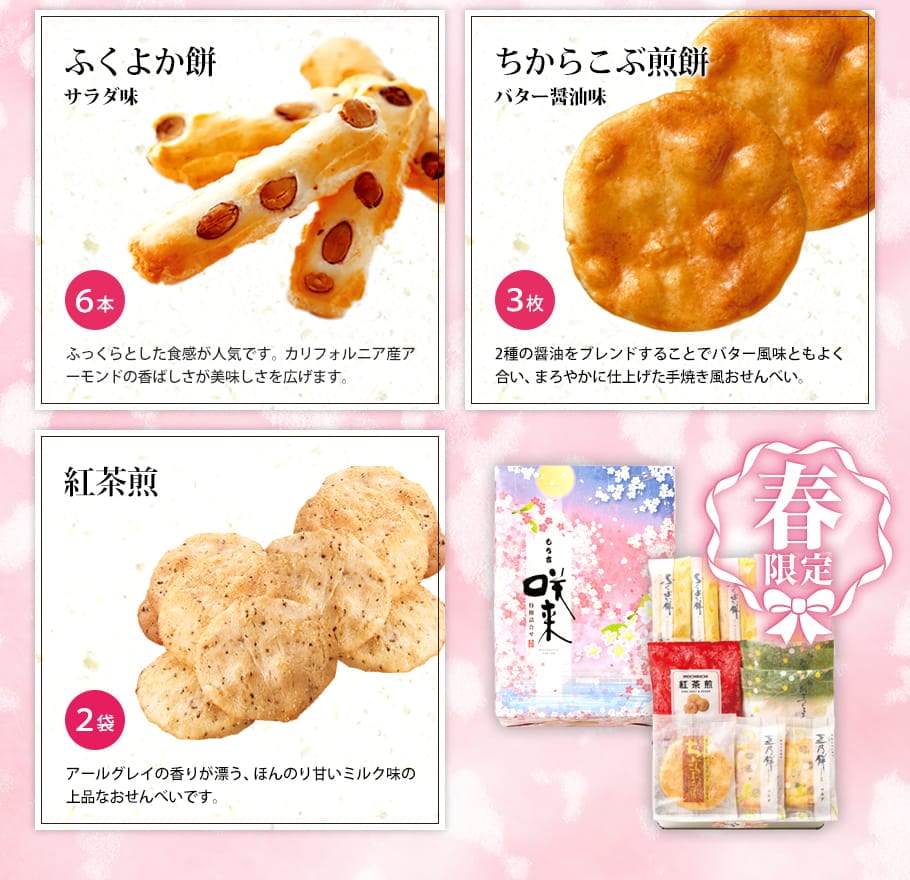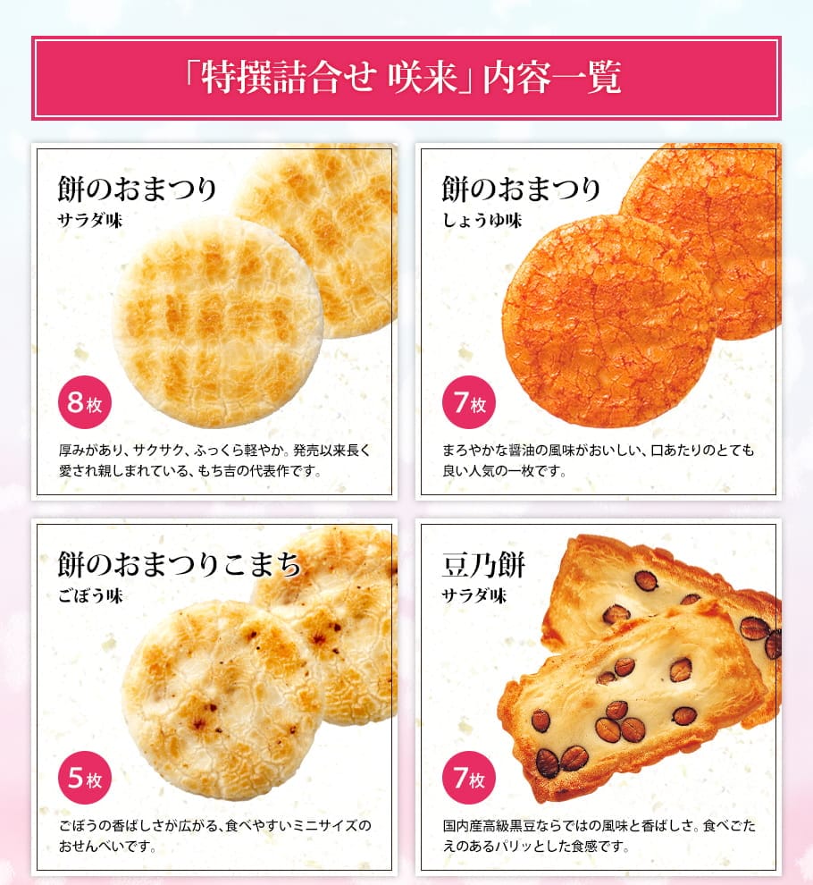 【通常便】(※期日指定3月31日までお届け可)もち吉 特撰詰合せ 咲来【国産米100% 7種38枚】