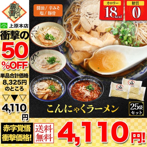 【50%OFF!単品合計価格8,325円→4,110円!】 糖質ゼロ 糖質オフ 糖質0 糖質OFF 国産 ダイエット 豆乳こんにゃく麺 こんにゃくラーメン 25パック Bセット( 醤油×7 辛味噌×6 塩×6 豚骨×6 ) 送料無料 訳あり わけあり 食品 家庭用
