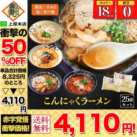 【50%OFF!単品合計価格8,325円→4,110円!】 糖質ゼロ 糖質オフ 糖質0 糖質OFF 国産 ダイエット 豆乳こんにゃく麺 こんにゃくラーメン 25パック Cセット( 醤油×7 辛味噌×6 塩×6 担々麺×6 ) 送料無料 訳あり わけあり 食品 家庭用