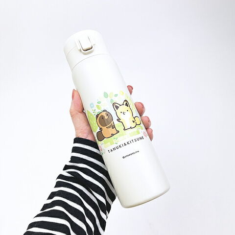 タヌキとキツネのワンプッシュステンレスボトルです。保冷、保温対応なのでランチのお供にはもちろん、オフィスや学校用にもぴったり☆軽量かつ片手でらくらくワンタッチオープンなのでお子様にも◎タヌキとキツネ好きの方はぜひGETしてみてください【容量:480ml】