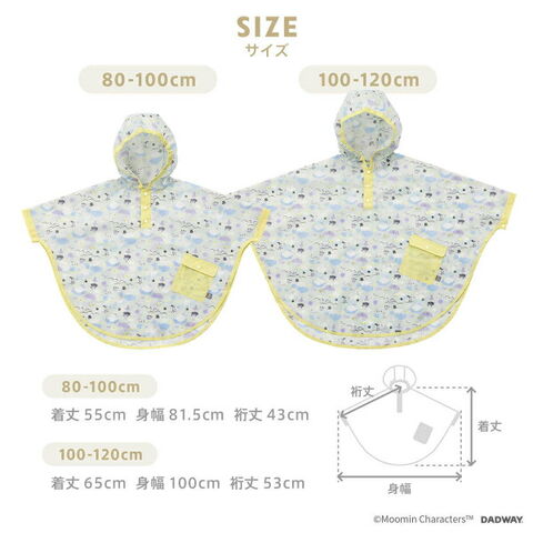 長い間着られるのがうれしいレインポンチョ。ムーミンたちが雲の上で過ごしているテキスタイル。カフス風の袖口で腕周りすっきり動きやすい。頭の形に合わせた丸い形のフードは、お顔にフィットするゴム入り仕様。お子さまも出し入れしやすい収納袋付き。裾には星型の反射プリントで暗いときも安心。■手洗いできます。■他のものと分けて洗ってください。■蛍光増白剤を含んだ洗剤は使用しないでください。■柔軟剤は使用しないでください。■使用後は速やかに水分を取り除いて陰干しを行い、風通しの良い場所で保管してください。【サイズ:着丈55cm、身幅81.5cm、裄丈43cm】