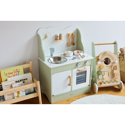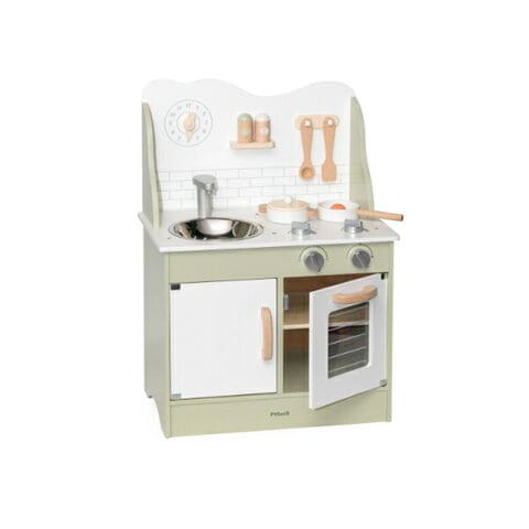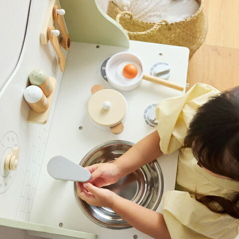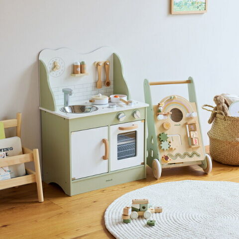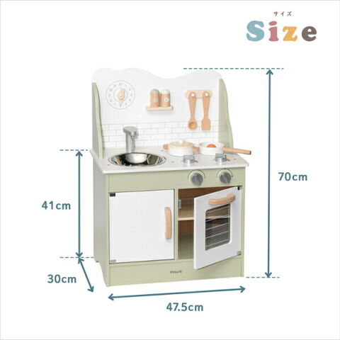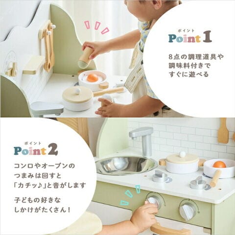食への興味を育もう!お部屋におきたいおしゃれキッチンです。調理道具や調味料の8点付きで、すぐに遊べるおままごとキッチン☆回すとカチカチと音が鳴るコンロのつまみ、針が回せる時計、手洗いの練習にもなるシンクと蛇口、遊びの幅が広がるオーブンなど子どもの興味をひくしかけがいっぱい♪扉の中はキッチンの調理道具やお気に入りのおもちゃを収納できるスペースになるので、お部屋もすっきりお片付けできます!インテリアとしてお部屋に溶け込む優しいデザインです☆彡