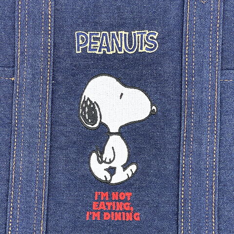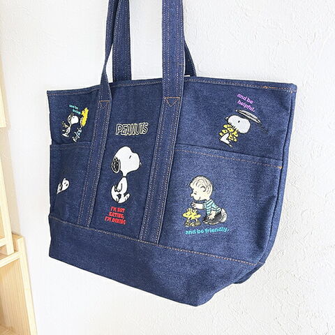 スヌーピーのトートバッグです♪スヌーピー達の可愛い刺しゅうと、デニム素材がとってもキュート♪マチが広く、ポケット付きで機能性も◎しっかりとした素材なので、お出かけや荷物が多い日にピッタリ☆彡