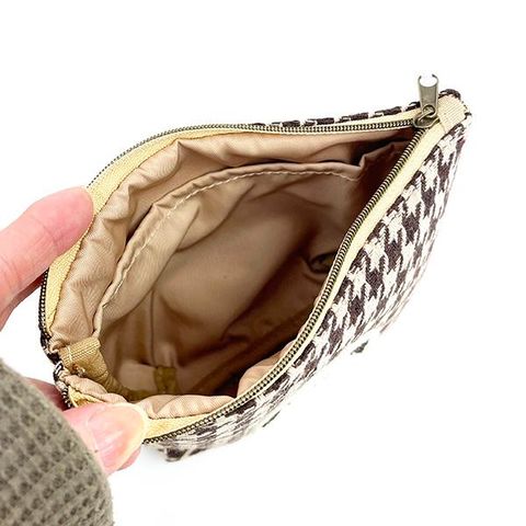 人気のモカカラーの千鳥格子がこれからの季節にぴったり♪サガラ刺繍のワッペンもポイントです!マチ付きでたっぷり入る使い勝手の良いポーチです。