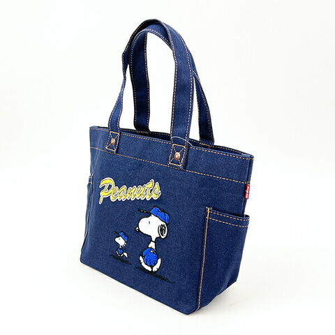 デニム生地がカッコイイ、野球デザインのスヌーピーはカワイイミニトートです。サイドに付いているポケットがオシャレ♪