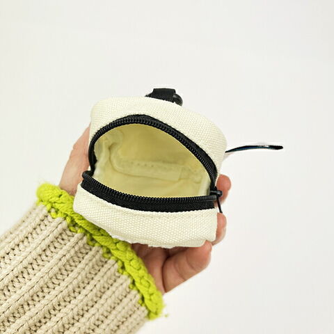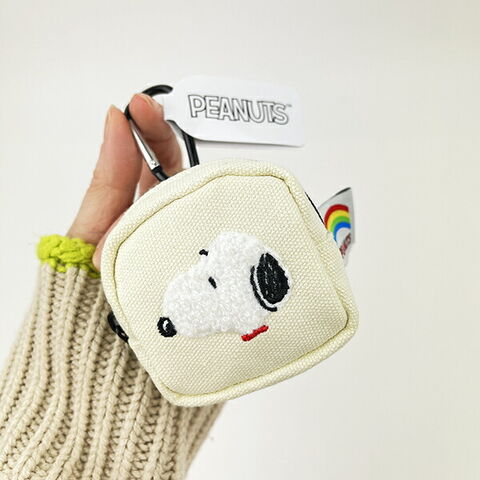 手のひらサイズの小さなポーチです。カラビナ付きなのでバッグにアクセサリー感覚で付けられます♪目を惹くワンカラーにふわふわのスヌーピーがカワイイ!!こちらはホワイトです。