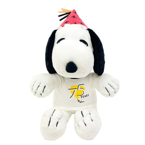 PEANUTS75周年特別デザインのスヌーピーぬいぐるみです。パーティーハットと75周年Tシャツを着てお祝いムードなのがとってもキュート♪ぜひ同じシリーズの仲間を並べて一緒に周年をお祝いしてみてください☆彡