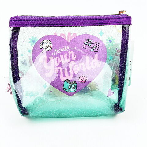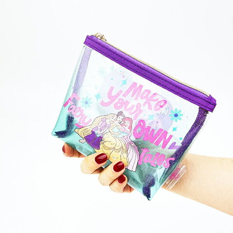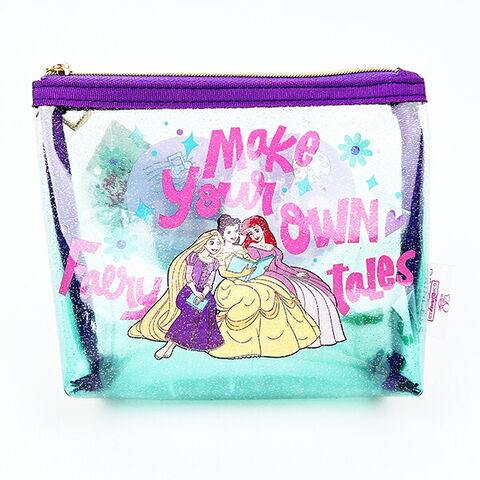 ディズニープリンセスの両面クリア素材で中身が確認できるラメクリアポーチです。キラキラで可愛い♪コスメや小物を入れるのにちょうどいいサイズ感◎魅せる収納もできちゃいます♪可愛いハート型のファスナーチャームがおすすめのポイントです☆