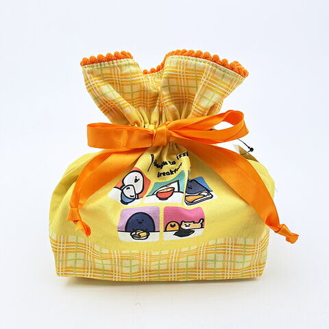 お文具さんたちが仲良く朝ごはんを食べている朝食シリーズです♪元気をもらえるカラーリングで、開け口にポンポンがついたほっこりかわいいマチ付の巾着♪