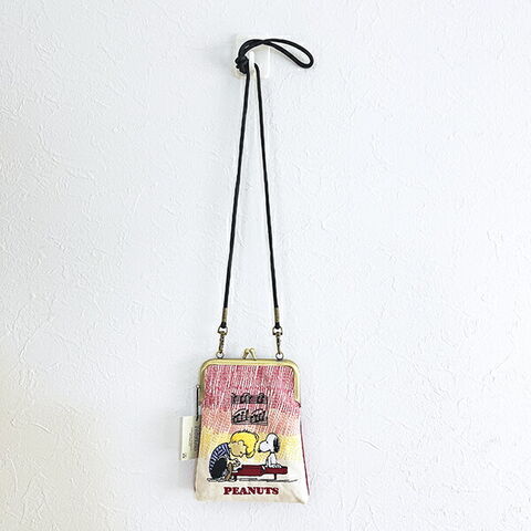 スヌーピーの畳刺繍ペンポーチです。中身が取り出しやすい便利ながま口タイプ♪手ぶらで使えるショルダータイプなので便利☆縦型タイプなのでスマホなどを入れて持ち運べます!お散歩などのお供にぴったりです☆彡