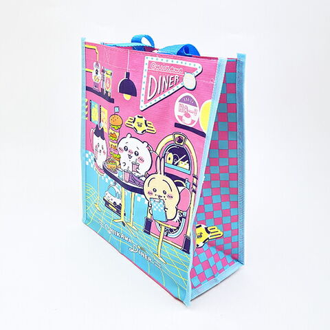 アメリカンダイナーで楽しく食事をするちいかわたちを80年代ポップなカラーリングでアレンジしました!背景の小物にも注目!!レストランの卓上POPをイメージしたPPバッグです。レジャーシートのようなPP素材で軽量なバッグ♪サブバッグとしても◎とっても可愛いデザインなのでぜひ同シリーズのアイテムで揃えてみませんか?