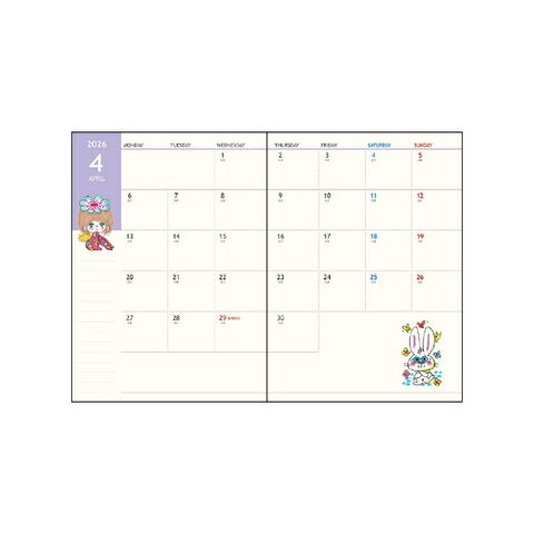 水森亜土の可愛い女の子がデザインされている月間手帳です。大人可愛い色合いがキュート♪カレンダーやメモところにも亜土ちゃんがいてスケジュールを管理する際も楽しい気分で書き込めます☆裏面の可愛いキャラクターにも注目♪亜土ちゃん好きの方はぜひお手に取ってみてください☆彡【内容】・カレンダー(2026・2027)・年間プラン・月間スケジュール(2025.10~2026.12)・メモ・各種情報ページ※月間ページ:六曜入