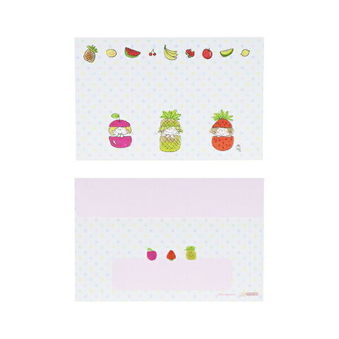 水森亜土のレトロかわいいレターセットです。デザインいっぱいで毎日違う絵柄を楽しめます☆フルーツいっぱいのデザインに心ときめくシリーズです♪亜土ちゃん好きの方にはたまらない~!ぜひ同じシリーズの文具を揃えてみてください☆【サイズ】封筒:9.5cm×14.5cm、便箋:9cm×13.5cm