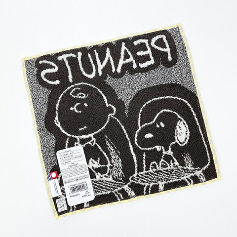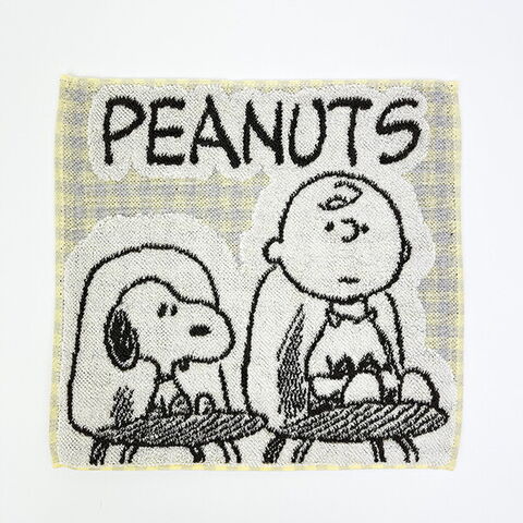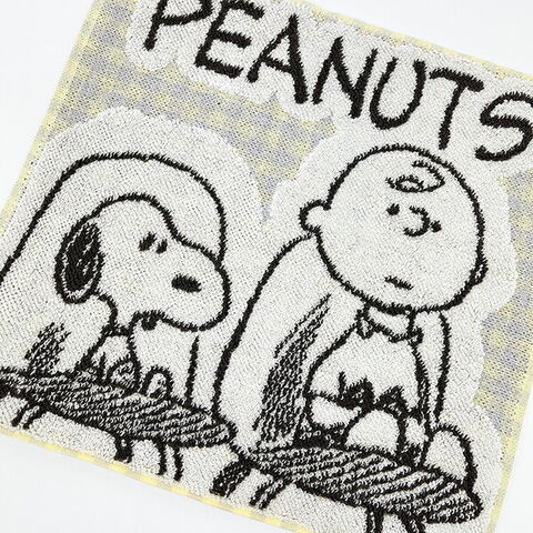 スヌーピーとチャーリーブラウンが椅子に座ってお話しする様子をジャカード織で描いたミニタオル♪ふんわりやわらかい素材です◎