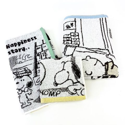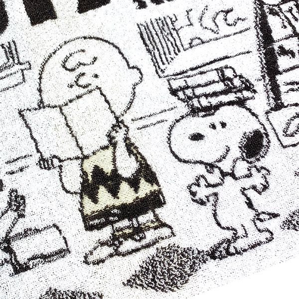 マイタウンをテーマにしたデザインがかわいい♪スヌーピーと仲間たちをジャカード織で表現した、柔らかな肌ざわりのタオルです。今治タオルブランドネーム付き。
