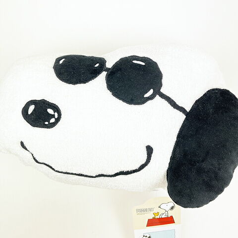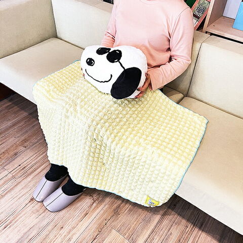 ブランケットが入っている、スヌーピーフェイスクッションです。ブランケットを使いたい時に中から出して使えます。さらっとした生地が気持ち負いブランケットです。こちらはイエローです。【ひざ掛け100×70cmクッション約35×25cm】
