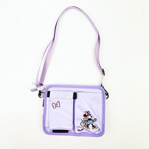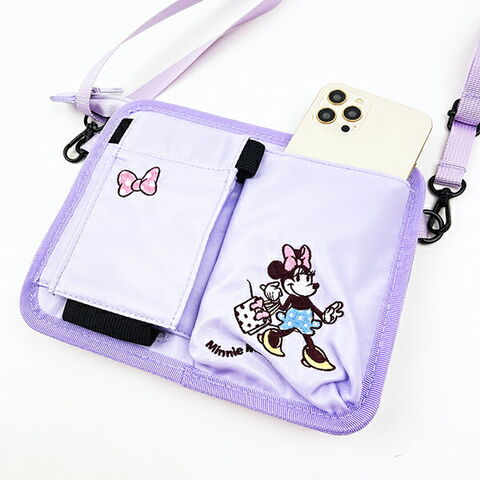 キャリーケースの取っ手につけたり、ショルダーバッグとして2WAYで使えます。ポケットにはスマホとドリンクホルダーがあり、ドリンクはペットボトルとカップ型も入れられます。こちらはミニーちゃんです。
