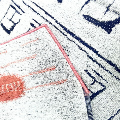 ハローキティが自転車に乗って街をお出かけ♪手書きの温かい雰囲気のあるおうちと刺繍で描かれたキティちゃんがかわいい商品です。