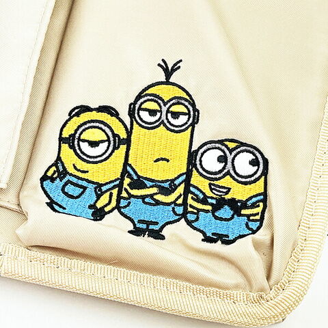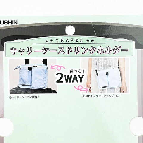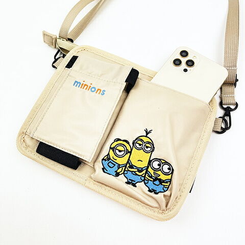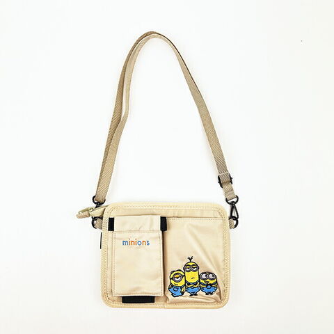 キャリーケースの取っ手につけたり、ショルダーバッグとして2WAYで使えます。ポケットにはスマホとドリンクホルダーがあり、ドリンクはペットボトルとカップ型も入れられます。こちらはミニオンズです。