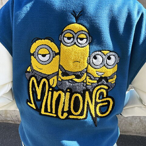 カッコイイスタジャンにカワイイキャラクターでユニセックスに着れます♪背中にメイン柄があり、袖や胸の部分にもイラストがデザインされていて素敵!胴の部分は厚めの生地で、袖は合皮でカッコイイ。秋~春と長く着ていて抱ける一着です。こちらはミニオンのデザインです。