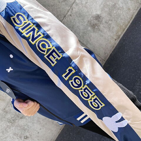 カッコイイスカジャンにカワイイキャラクターでユニセックスに着れます♪背中にメイン柄があり、袖や胸の部分にもイラストがデザインされていて素敵!薄手なので春や秋などに着ていただける一着です。こちらはミッフィーデザインになっています。