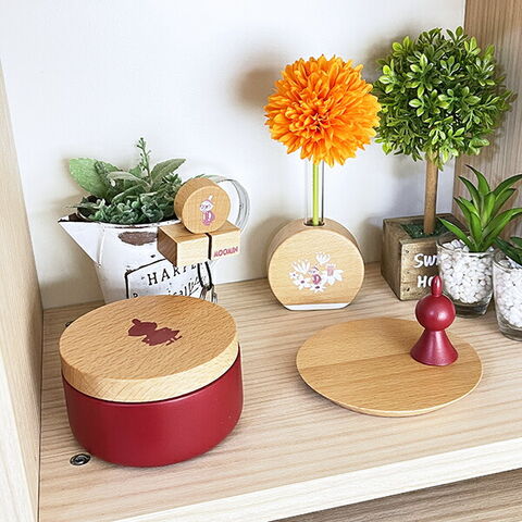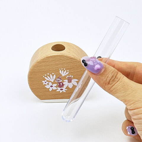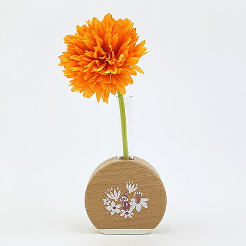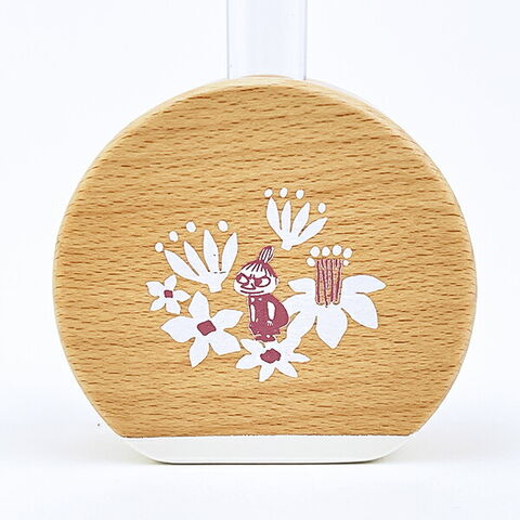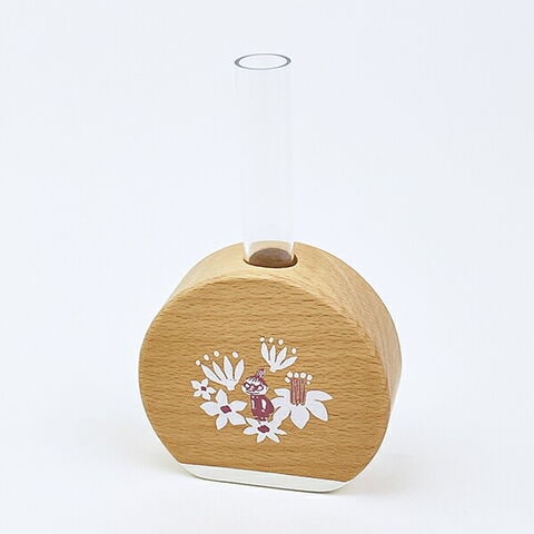 リトルミイのアートが映えるビーチ材の柔らかな質感が心地よい手のひらサイズの一輪挿しです。コンパクトなサイズなので、デスクや窓脇、玄関先場所を問わずに使用可能◎優しい風合いのアイテムなのでどんな方でも使いやすくておすすめです♪