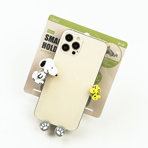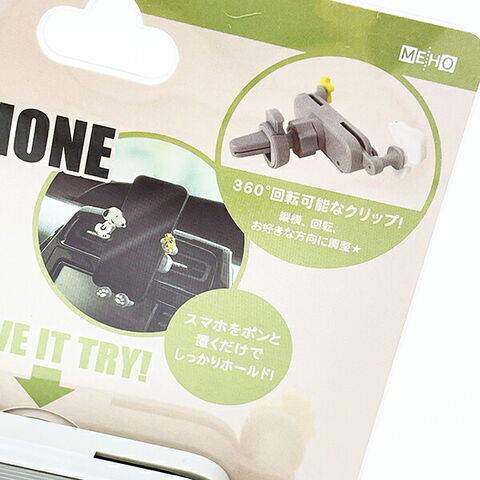 スヌーピーのスマホホルダーです。車のエアコン吹き出し口に取り付けてお使いいただけます☆スマホをポンっと置くだけでしっかりホールド!360°回転可能なクリップで使い勝手◎お好きな方向に調節してお使いください♪