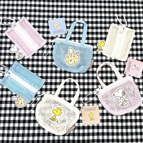 『スヌーピー』のバッグ型のミニポーチです。ボールチェーンでカバンに付ければお気に入りの小物を可愛く持ち運べます。ハンドジェルやリップ等の小物を入れるのに便利!。透け感がオシャレなメッシュ生地に刺繍された、大人っぽく可愛らしいデザイン♪