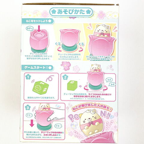 飛び出したら勝ち!のゲームです。サイコロをふって、出た目の分だけチューリップの土台を回します。その後、平らな面に本体を置いて上から押し込みます。アタリを引いてねこが飛び出したらそのプレイヤーの勝利です!!インテリアとしても進めの可愛さ♪