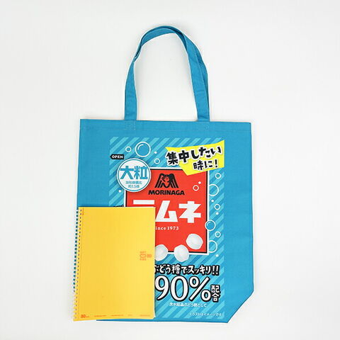 40年以上も愛され続ける、身近なおやつの大定番の「森永ラムネ」のトートバッグです。底マチつきで、A3サイズの書類も入る大きさです。