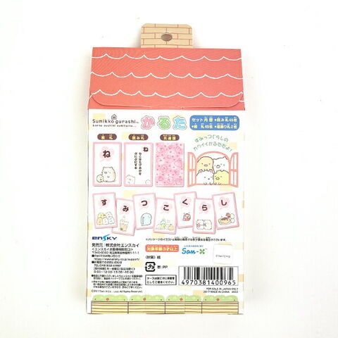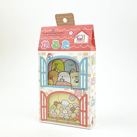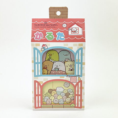 ちょっぴりネガティブで個性的なすみっコたちの可愛いかるたです。読み札は「あぶらっぽいからのこされちゃった…」など、すみっコらしさがいっぱい詰まっています。パッケージはすみっコたちが暮らしているようなハウス型のデザインです。パッケージの窓からは中身の札(窓飾り札)のすみっコたちが見えます。
